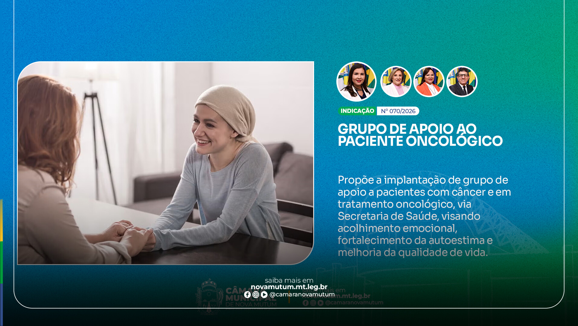 Pacientes oncológicos de Nova Mutum podem, em breve, contar com uma rede estruturada de acolhimento e suporte emocional dentro do próprio município. Na 10ª sessão ordinária, realizada na segunda-feira, 13 de abril, o plenário da Câmara Municipal aprovou por unanimidade a Indicação nº 070/2026, de autoria da vereadora Beatriz Correa (União Brasil), com coautoria das vereadoras Carmem Casagrande (União Brasil) e Lurdes Costa Marques (Republicanos), e do vereador José da Paixão (União Brasil).