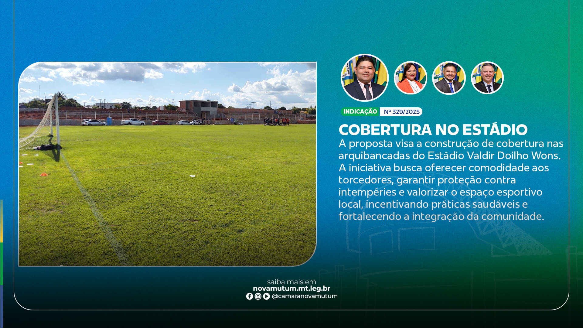 Em mais uma ação voltada para a melhoria da infraestrutura esportiva do município, os vereadores de Nova Mutum aprovaram por unanimidade, durante a 37ª Sessão Ordinária desta quarta-feira (17), uma indicação que propõe a construção de uma cobertura para as arquibancadas do Estádio Municipal Valdir Doilho Wons. A proposta, registrada sob o número 329/2025, é de autoria do vereador Altair Albuquerque (PP) e conta com a coautoria dos vereadores Lurdes Costa Marques (REPUBLICANOS), Maciel Sousa (REPUBLICANOS) e Lucas Badan Faria (UNIÃO BRASIL).