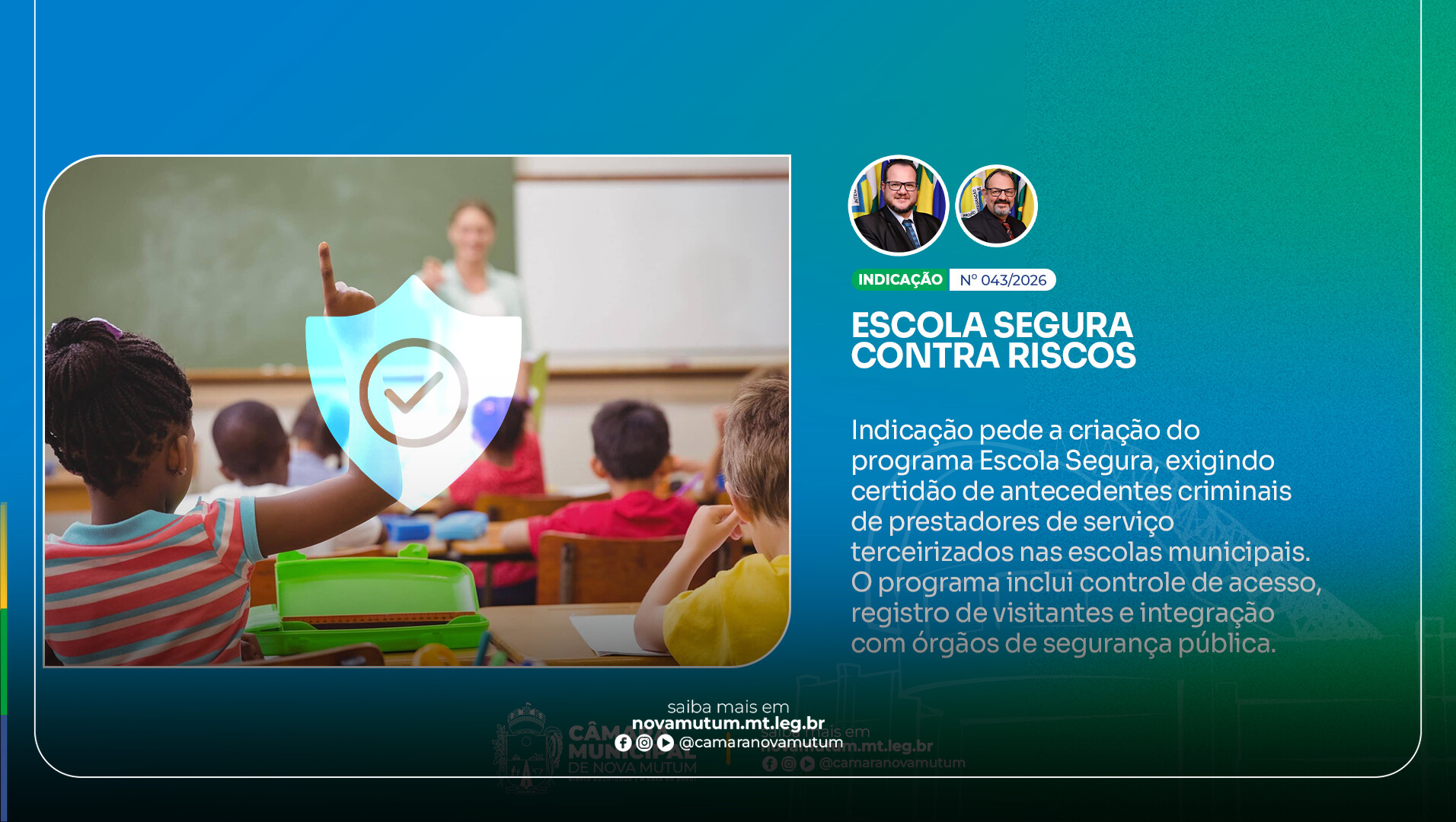 Em uma iniciativa voltada à proteção de crianças e adolescentes, a Câmara de Vereadores de Nova Mutum deu um passo importante na última segunda-feira, 23 de março. Durante a 7ª sessão ordinária, foi aprovada por unanimidade a Indicação nº 043/2026, que sugere ao Poder Executivo a criação do Programa "Escola Segura". A proposta, apresentada pelos vereadores Rafael Brignoni (PL) e Ricardo Schneider (PL), visa fortalecer a segurança no ambiente educacional, garantindo maior tranquilidade para toda a comunidade escolar do município.