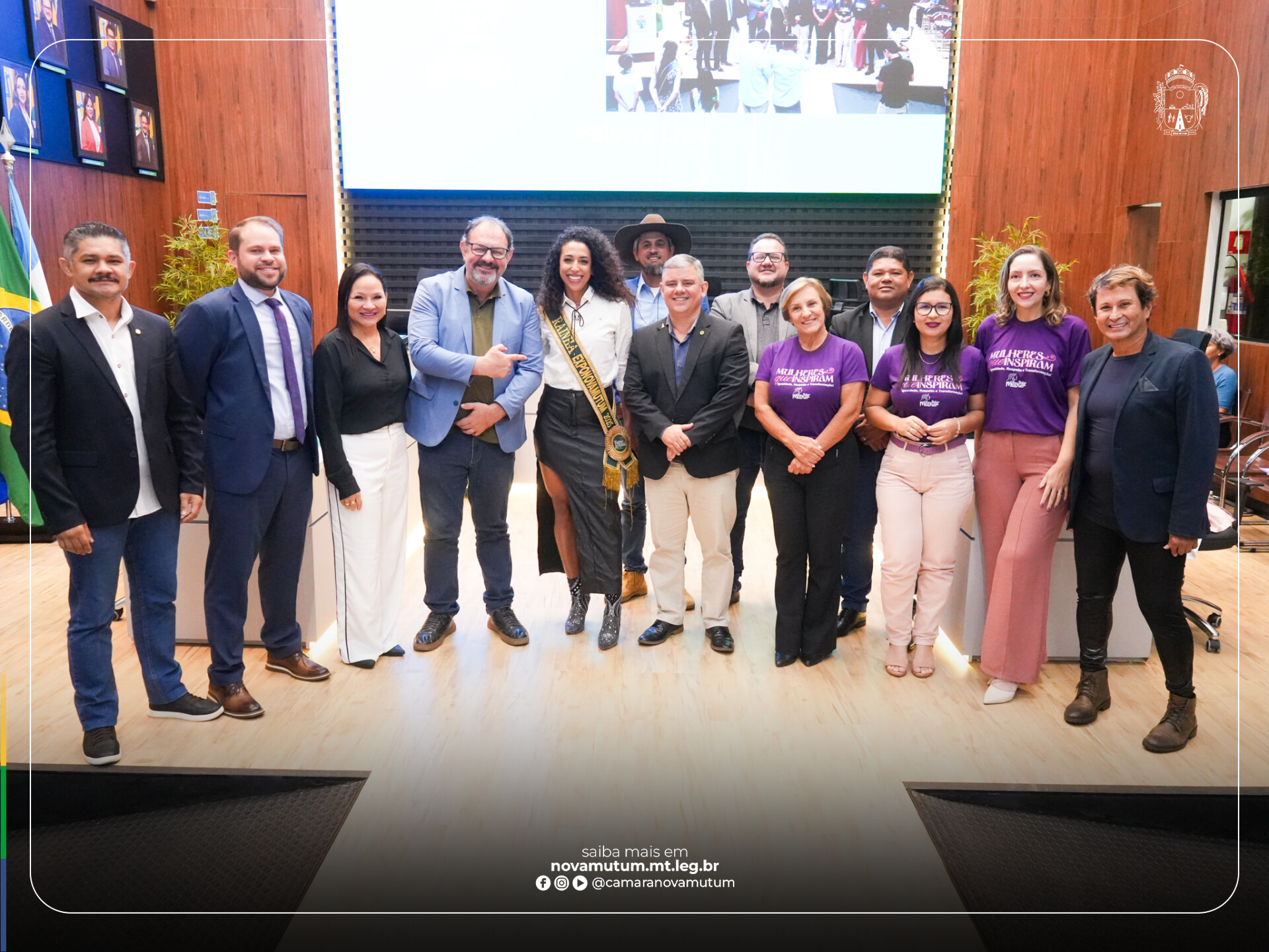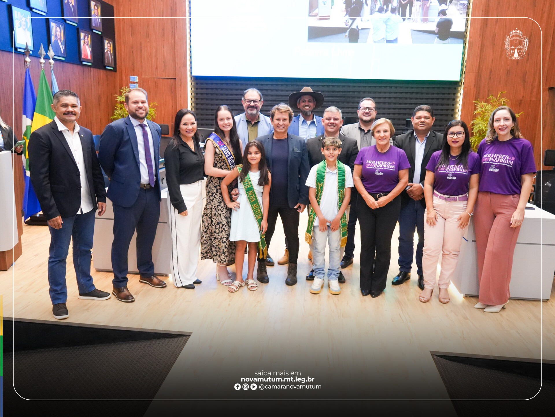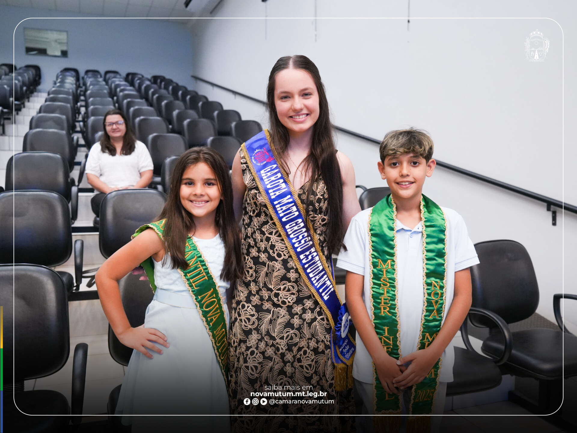 Durante a sessão, estiveram presentes os pequenos vencedores do Miss e Mister Estudantil Nova Mutum Infantil 2025: Kauã Soares Morisso, de 10 anos, aluno da Escola Lúcia Faccio Tasca, e Isabely da Silva Medeiros, de 8 anos, estudante da Escola 4 de Julho. Também integrou a comitiva Isadora Chemin, eleita Miss Estudantil Nova Mutum 2025 e atual Miss Estudantil Mato Grosso, título no qual conquistou o segundo lugar em nível estadual.