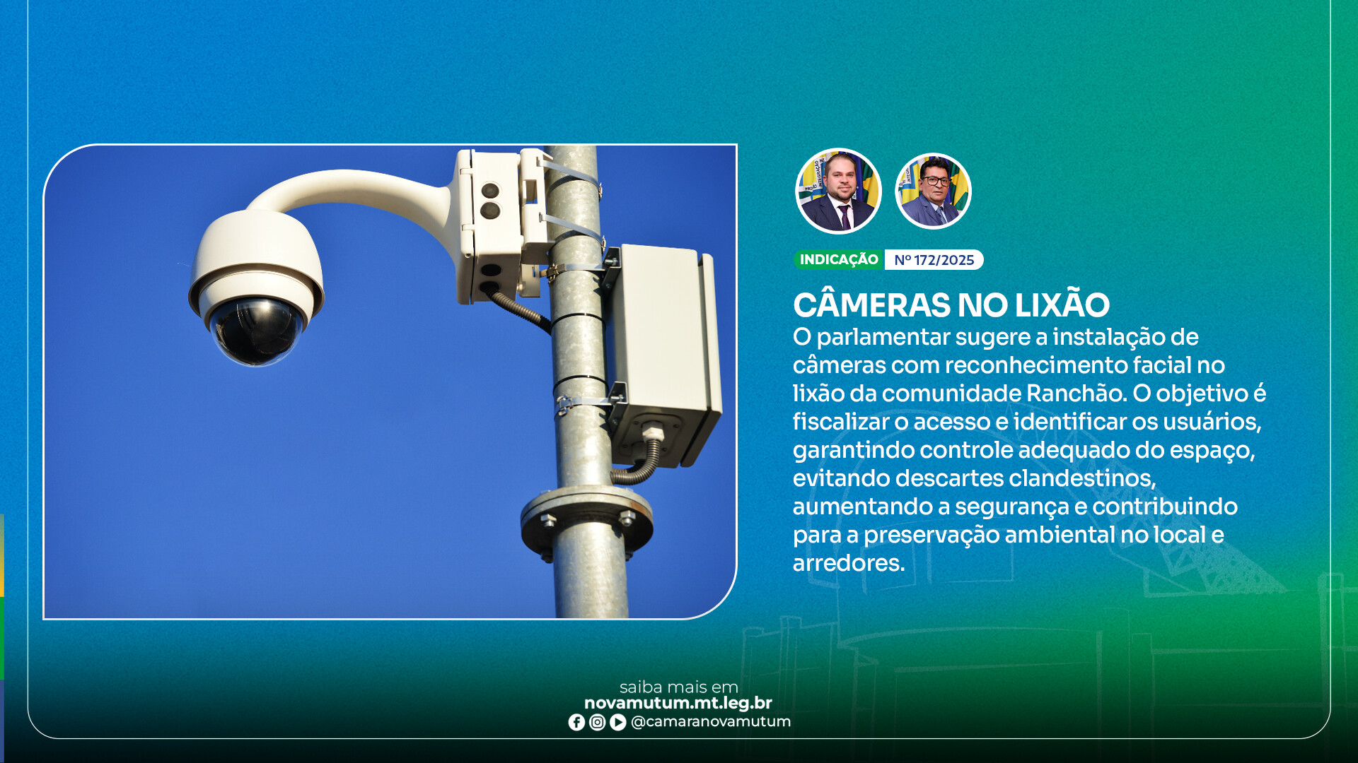 Em mais uma medida voltada à melhoria da gestão ambiental e da segurança pública, a Câmara Municipal de Nova Mutum aprovou, nesta segunda-feira (7), a Indicação nº 172/2025, de autoria do vereador Anderson Mantovan (União Brasil) e coautoria do vereador Baguncinha (PP). A proposta sugere à Prefeitura a instalação de câmeras com tecnologia de reconhecimento facial em todo o trajeto de acesso ao lixão da comunidade Ranchão, desde a entrada até a área de descarte dos resíduos.