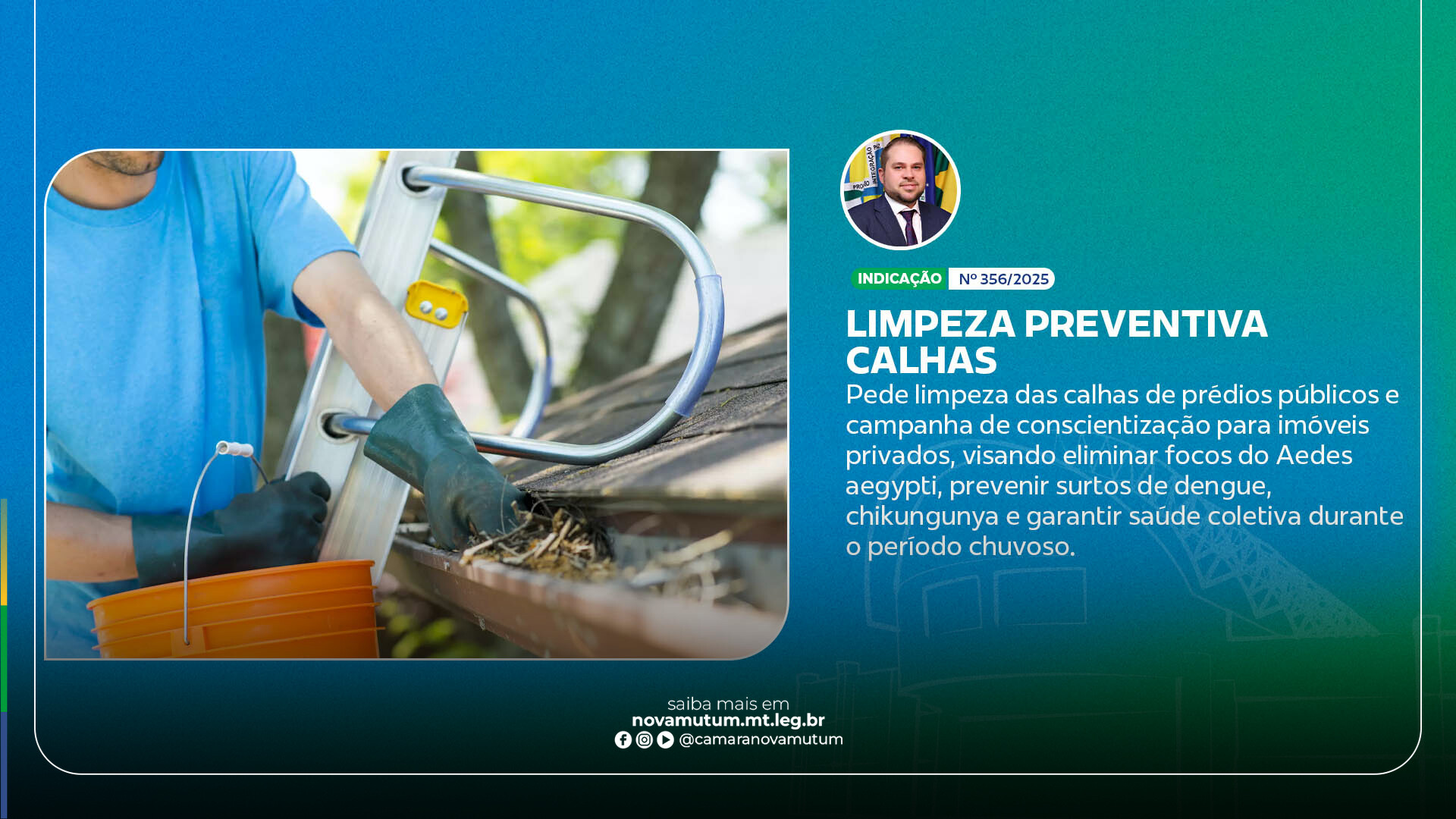 No contexto de prevenção às doenças transmitidas pelo Aedes aegypti, a Câmara Municipal de Nova Mutum aprovou por unanimidade, na sessão de segunda-feira, 1º de dezembro, uma indicação que propõe uma ação integrada de limpeza e conscientização. A proposta, de autoria do vereador Anderson Mantovan (União Brasil), solicita ao Poder Executivo a realização da limpeza e manutenção das calhas e rufos de todos os prédios públicos municipais, além de uma ampla campanha de orientação para a população.
