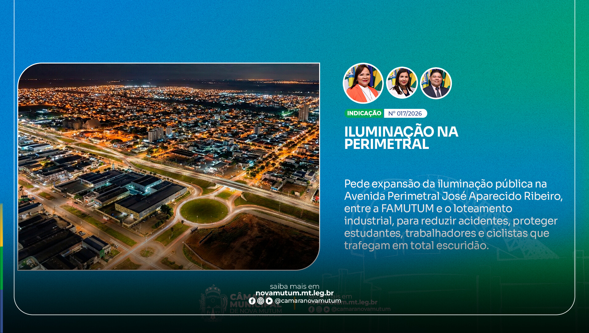 A Câmara Municipal de Nova Mutum aprovou, durante sessão ordinária, a Indicação nº 017/2026, de autoria da vereadora Lurdes Costa Marques (REPUBLICANOS), com coautoria da vereadora Beatriz Correa (UNIÃO BRASIL) e do vereador Altair Albuquerque (PP), solicitando ao Poder Executivo que intervenha junto à concessionária Energisa para viabilizar a expansão da rede de iluminação pública na Avenida Perimetral José Aparecido Ribeiro.