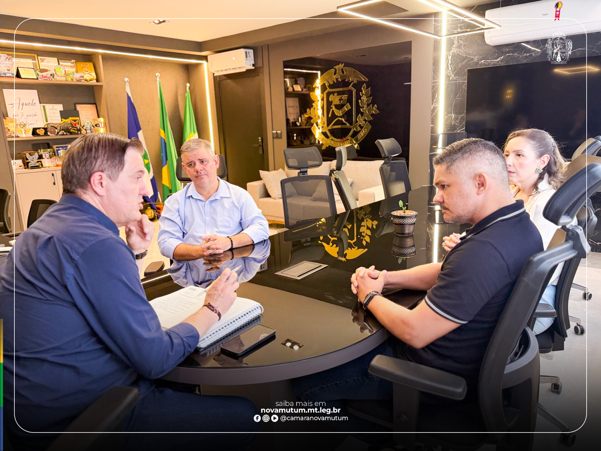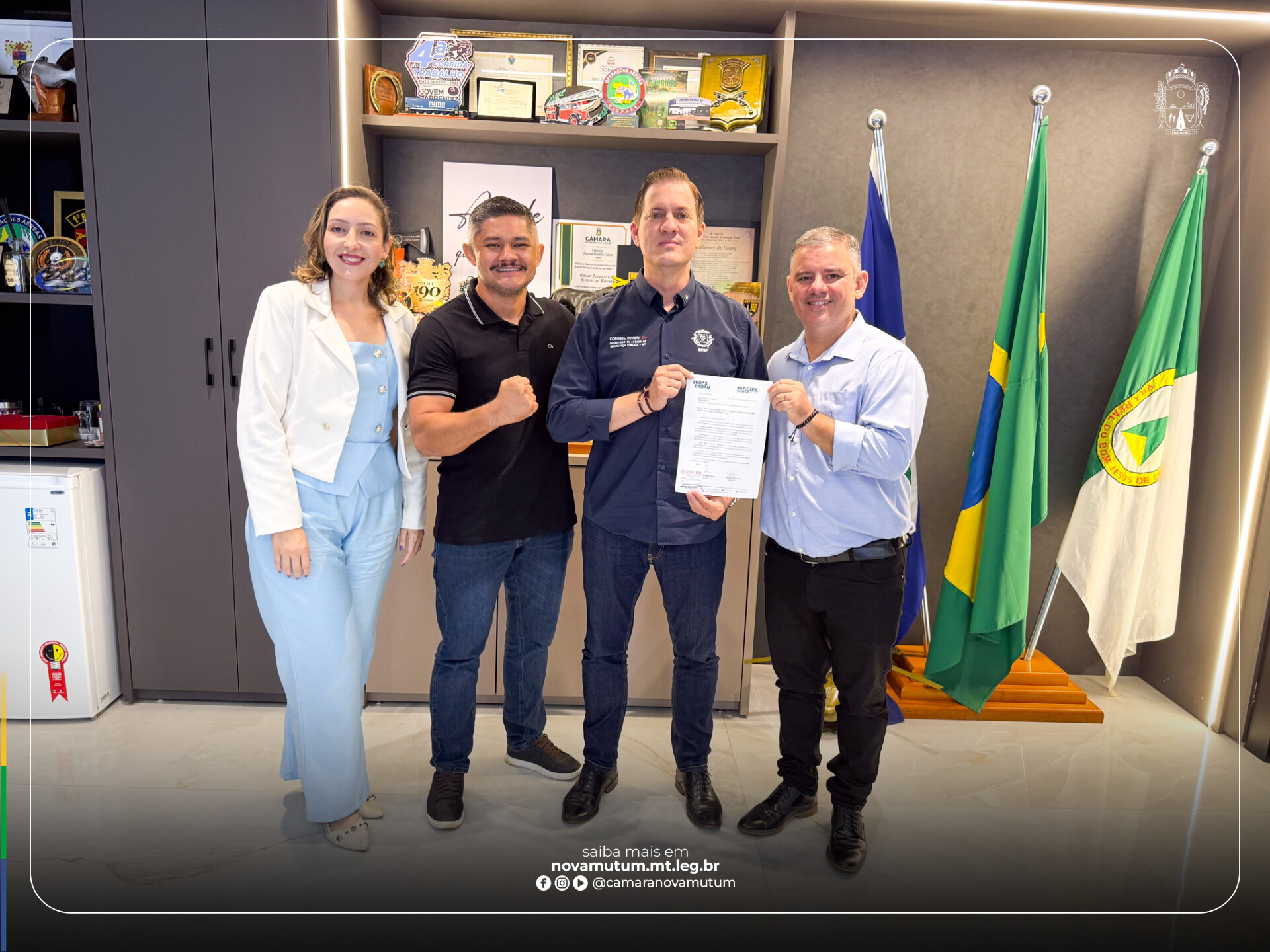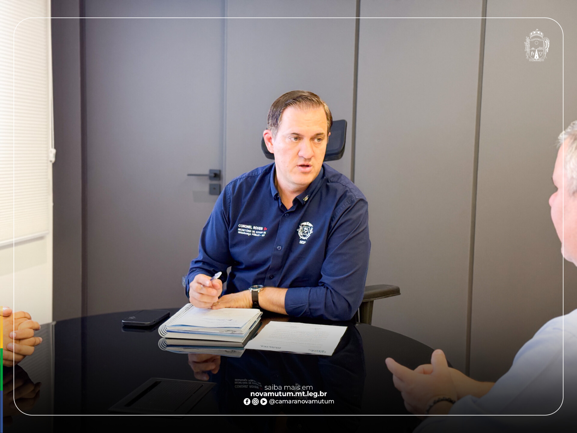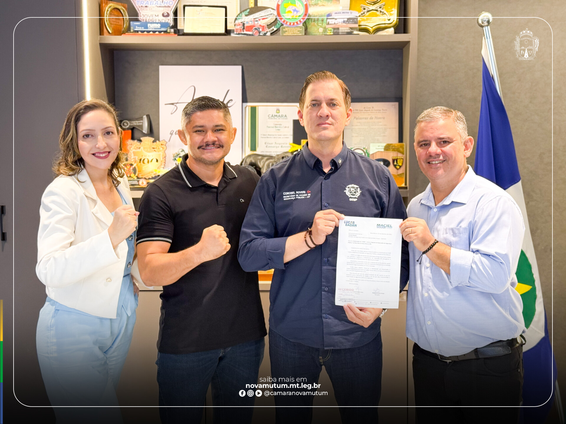 A iniciativa foi conduzida pelo presidente da Câmara, vereador Lucas Badan Faria (União Brasil), acompanhado pelo vereador Maciel Sousa (Republicanos) e pela vereadora Jaiane Santos (PP), durante reunião com o secretário de Segurança Pública de Mato Grosso, coronel César Rovéri.