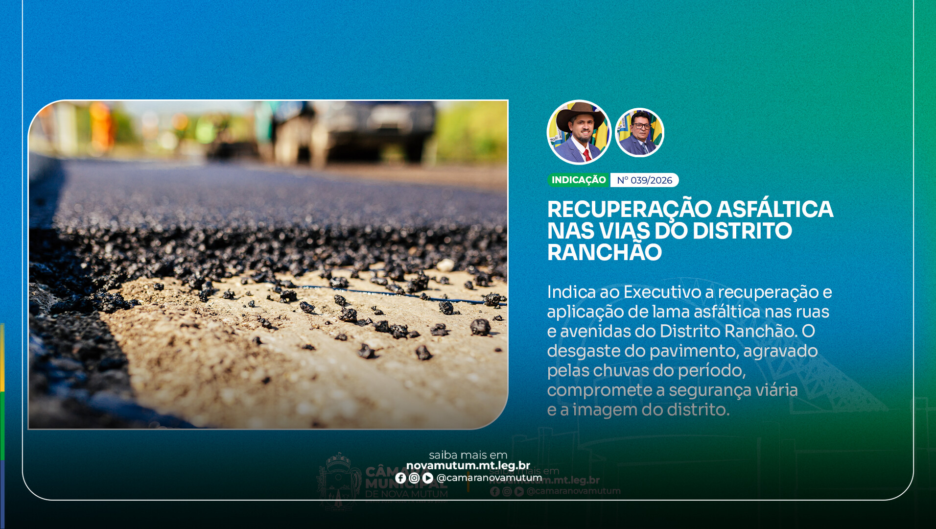 A iniciativa é de autoria do vereador Cristiano Bicô (Republicanos), com coautoria do vereador Baguncinha (PP), e nasce diretamente das demandas levadas pela população ao Legislativo. A justificativa da indicação é clara ao apontar que o asfalto das vias públicas do núcleo urbano do Ranchão encontra-se em situação precária, necessitando de intervenções urgentes de manutenção e restauração.