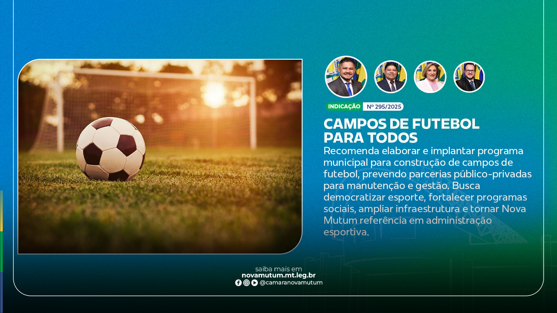 De acordo com a indicação, o programa prevê a construção de campos padronizados em pontos estratégicos da cidade, priorizando regiões com maior concentração populacional e carência de espaços esportivos. A proposta busca ampliar o acesso da comunidade a áreas adequadas para a prática esportiva e o desenvolvimento de projetos sociais voltados à inclusão e ao fortalecimento das famílias.