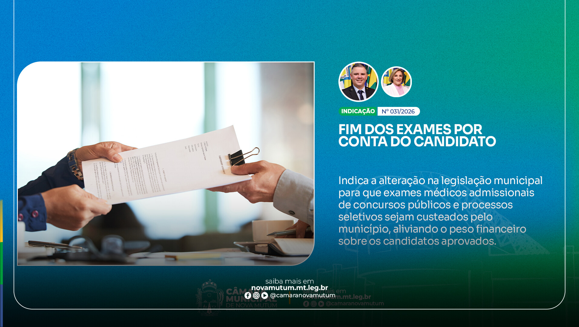 Passar em um concurso público deveria ser motivo apenas de celebração. Mas para muitos candidatos aprovados em Nova Mutum, a conquista vem acompanhada de um obstáculo financeiro imediato: o custo dos exames médicos admissionais, exigidos por lei antes da posse, mas pagos do próprio bolso do candidato. Essa injustiça foi levada ao plenário do Legislativo municipal na 5ª Sessão Ordinária de quarta-feira, 4 de março. O vereador Lucas Badan Faria (União Brasil), com coautoria da vereadora Carmem Casagrande (União Brasil), apresentou a Indicação nº 031/2026, sugerindo ao Poder Executivo a alteração das leis vigentes para que a administração pública municipal passe a arcar com essas despesas.