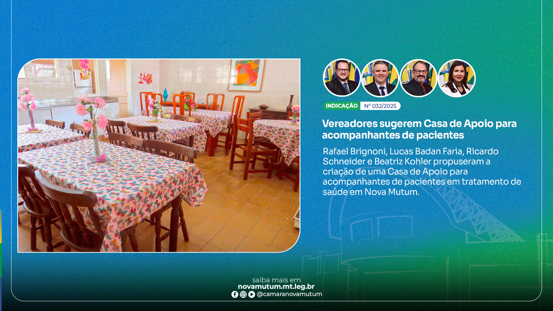 A proposta visa atender a uma demanda recorrente de familiares e acompanhantes que enfrentam dificuldades para se hospedar durante o período de tratamento de seus entes queridos. “Muitas pessoas vêm de outras cidades para buscar atendimento médico em Nova Mutum, e a falta de um local adequado para seus acompanhantes gera um custo adicional e desgaste emocional. A Casa de Apoio seria uma solução humanizada e necessária”, explicou Ricardo Schneider.