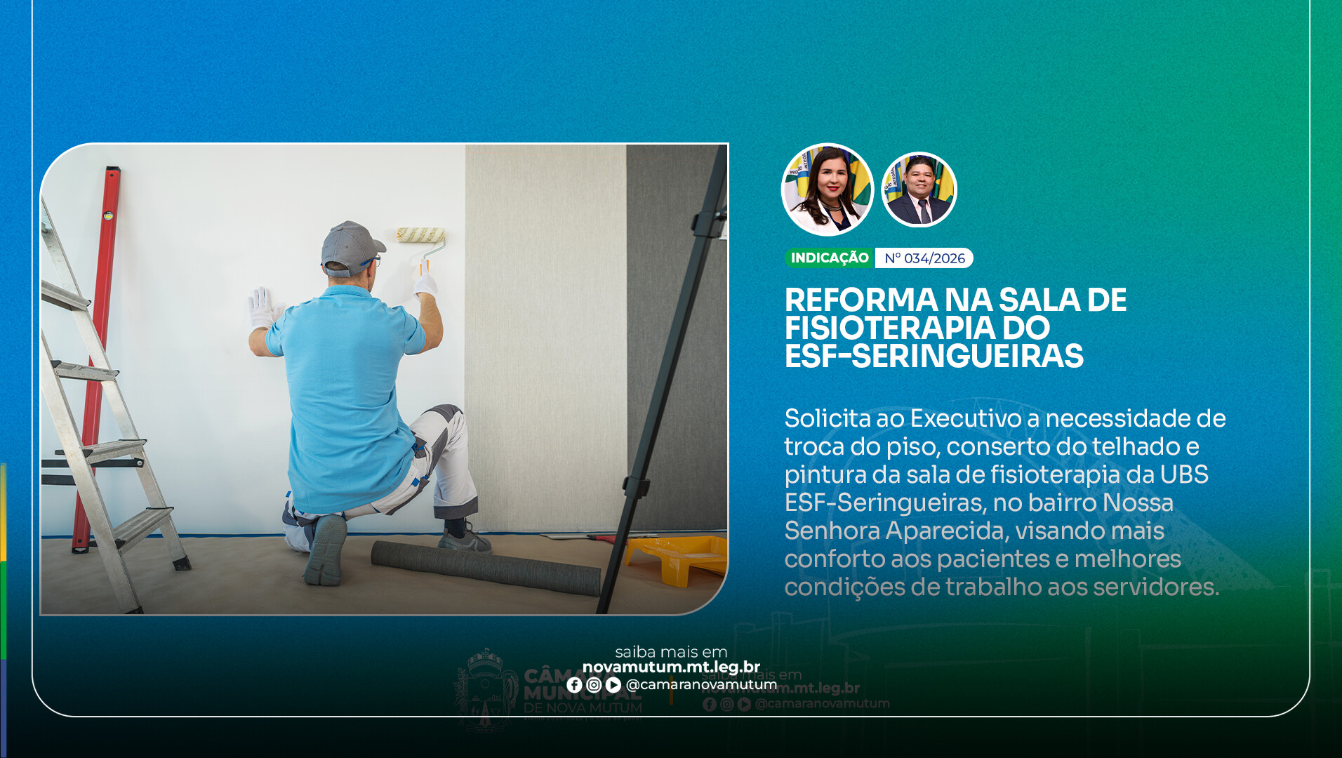 A qualidade do atendimento oferecido nas unidades básicas de saúde de Nova Mutum voltou a ocupar a pauta do Legislativo Municipal. Na 6ª Sessão Ordinária da Câmara de Vereadores, realizada na segunda-feira, 9 de março, foi apresentada e aprovada por unanimidade a Indicação nº 034/2026, que sugere ao Poder Executivo a realização de melhorias estruturais na sala de fisioterapia da Unidade Básica de Saúde ESF-Seringueiras, localizada no bairro Nossa Senhora Aparecida.