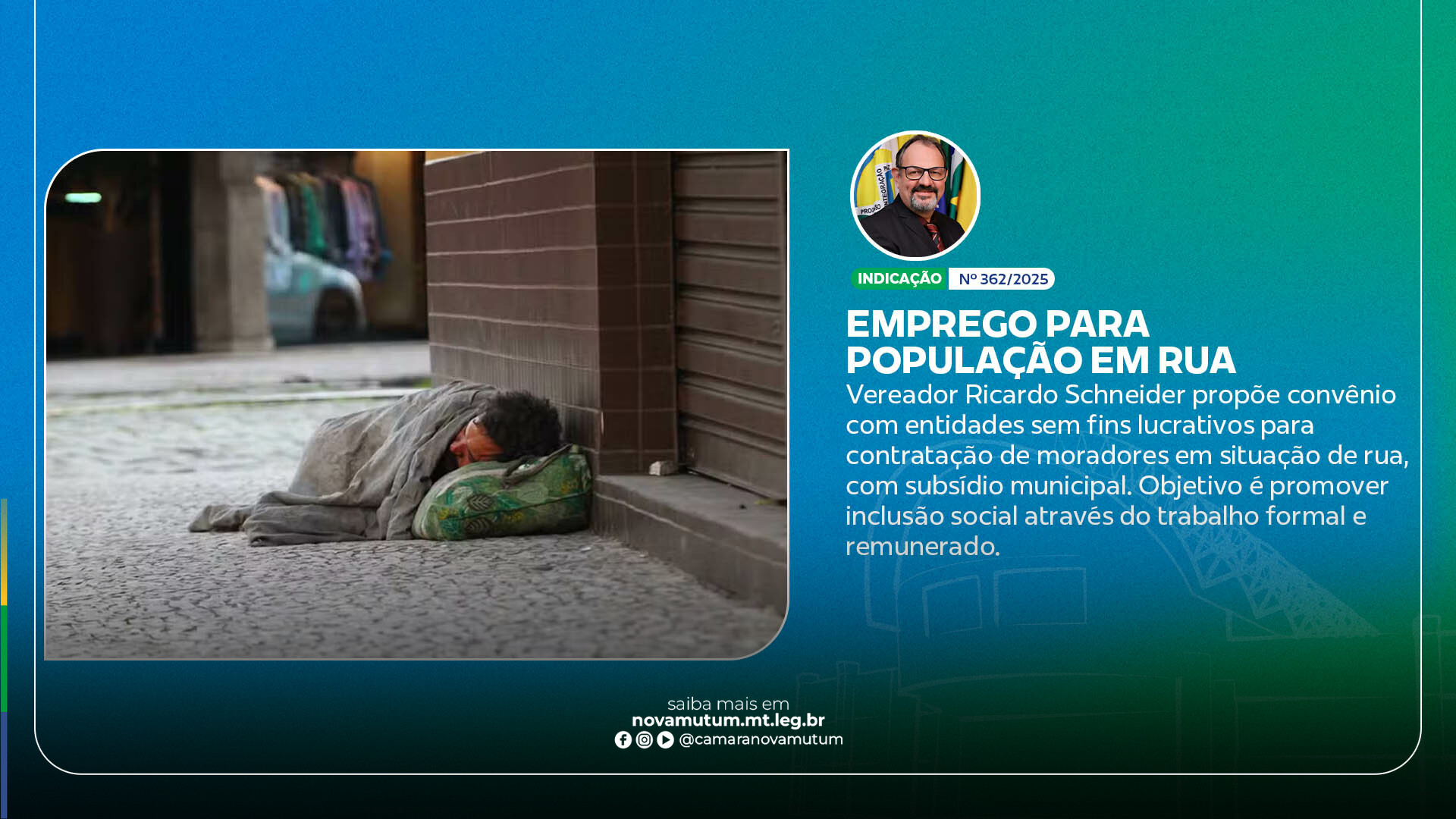 A 40ª sessão ordinária da Câmara Municipal de Nova Mutum, conduzida nesta quarta-feira, 8 de dezembro, teve entre seus destaques a aprovação unânime da Indicação nº 362/2025. Proposta pelo vereador Ricardo Schneider (PL), a matéria recomenda ao Poder Executivo a celebração de convênios com entidades e cooperativas sem fins lucrativos para contratação de moradores em situação de rua ou em vulnerabilidade social, com subsídio remuneratório financiado pelo município.