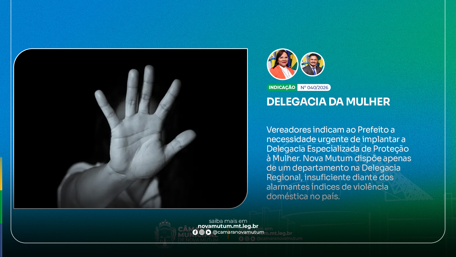 A proposta foi apresentada pela vereadora Lurdes Costa Marques (Republicanos), com coautoria do vereador Maciel Sousa (Republicanos), e chama atenção para uma lacuna estrutural no atendimento às vítimas de violência doméstica em Nova Mutum. Atualmente, a Delegacia Regional de Polícia Civil conta apenas com um Departamento de Crimes Contra a Mulher, sem a especialização e a estrutura que uma delegacia dedicada exclusivamente a esse público poderia oferecer.