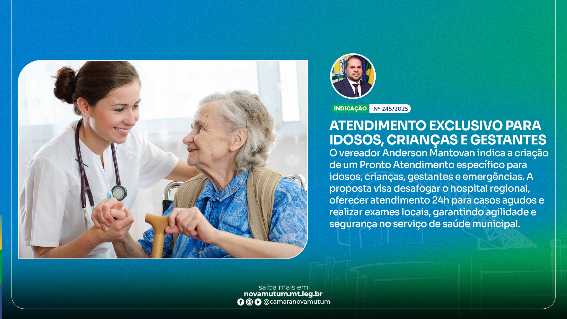 Em uma iniciativa voltada para o fortalecimento da saúde pública, o vereador Anderson Mantovan (UNIÃO BRASIL) apresentou à Câmara Municipal de Nova Mutum a Indicação nº 245/2025, que propõe a implantação ou adaptação de um Pronto Atendimento exclusivo para idosos, crianças, gestantes e casos de emergência. A proposta, aprovada por unanimidade durante a 28ª Sessão Ordinária, busca oferecer um serviço especializado e ágil para esses grupos vulneráveis.